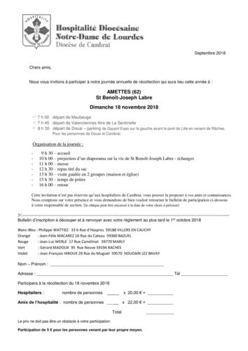 Le dimanche 18 novembre, aura lieu notre journée de récollection dans le village natal de St Joseph Benoit Labre, à Amettes. Tous les renseignements sur la feuille jointe.